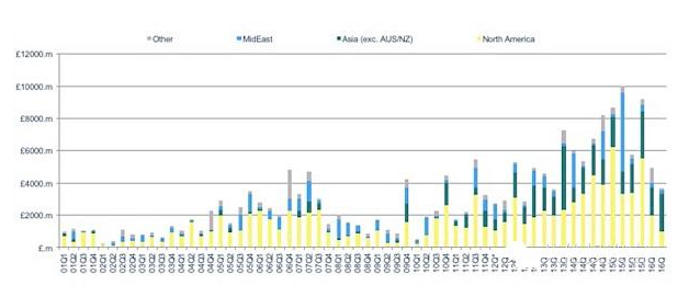 图为RCA统计的非欧盟国家对英国地产投资的走势变化,蓝色为中东,黄色为北美,绿色为亚洲,我们可以看到中东投资者一直表现稳健,北美投资者走势和英国地产的经济周期几乎一致,亚洲投资者(包括经济腾飞的中国在内)对英投资一直呈上升趋势。