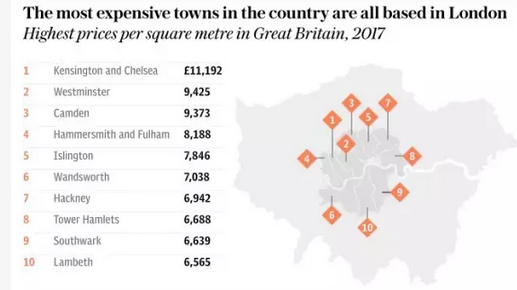 第一名是伦敦传统富人区Kensington and Chelsea,每平米的房间都高达11,192英镑,其次是Westminster,Camden,前十名竟然都在伦敦。