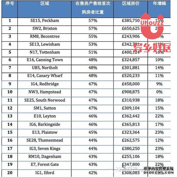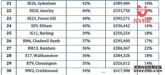 以下为伦敦备受首次购房者青睐的30个区域完整版,以区域房产中出售给首次购房者百分比排序: