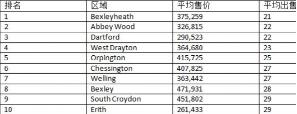 Dartford的平均售价仅为290,523英镑,同样平均22天售出,排名第三。在十个好卖区域中,排在第八的Bexley的平均售价最高,471,931英镑;第十的是Erith,261,433英镑,平均29天售出。