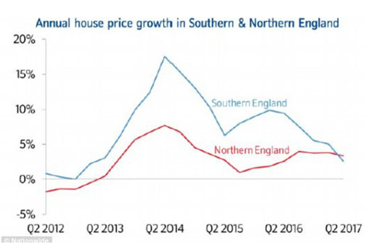 北英格兰的房价年度涨幅为3.3%,包括West Midlands,East Midlands,Yorkshire&Humberside,西北部和北部地区。而南部地区,包括西南、东南外围、大都市圈外围、伦敦和东安吉利亚,房价同期增幅只有2.6%。这是金融危机以来,北部地区的房价第一次上涨更快。
